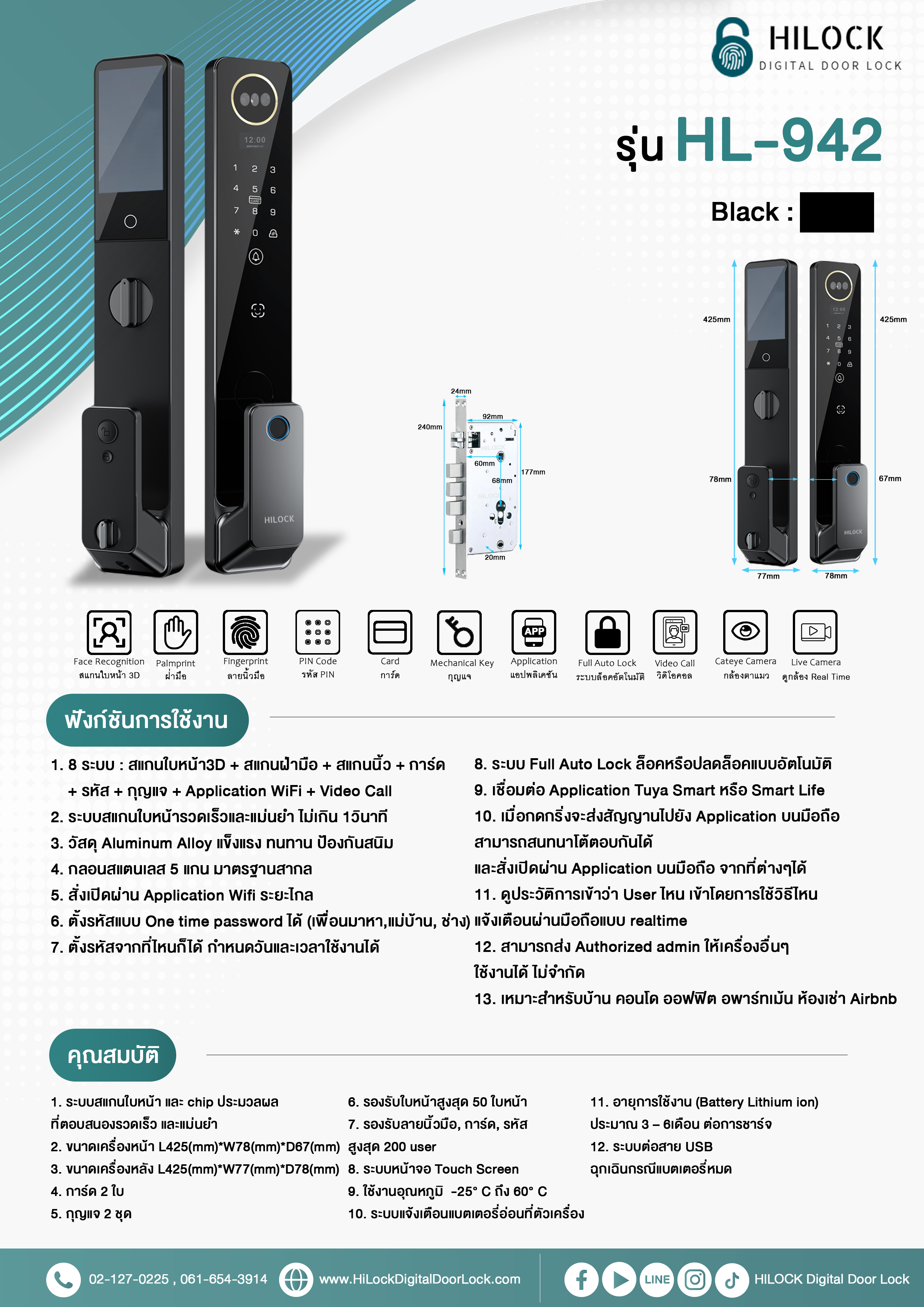 Digital Door Lock รุ่น HL-942 สีดำ ผลิตจากวัสดุ Aluminum Alloy แข็งแรง ทนทาน ป้องกันสนิม สามารถใช้งานด้วยระบบเปิดประตูแบบ 7 ระบบ : สแกนใบหน้า3D + สแกนนิ้ว + การ์ด + รหัส + กุญแจฉุกเฉิน + Application WiFi + Video Call + Live Camera ประตูดิจิตอลมาพร้อมกลอนสแตนเลส 5 แกน