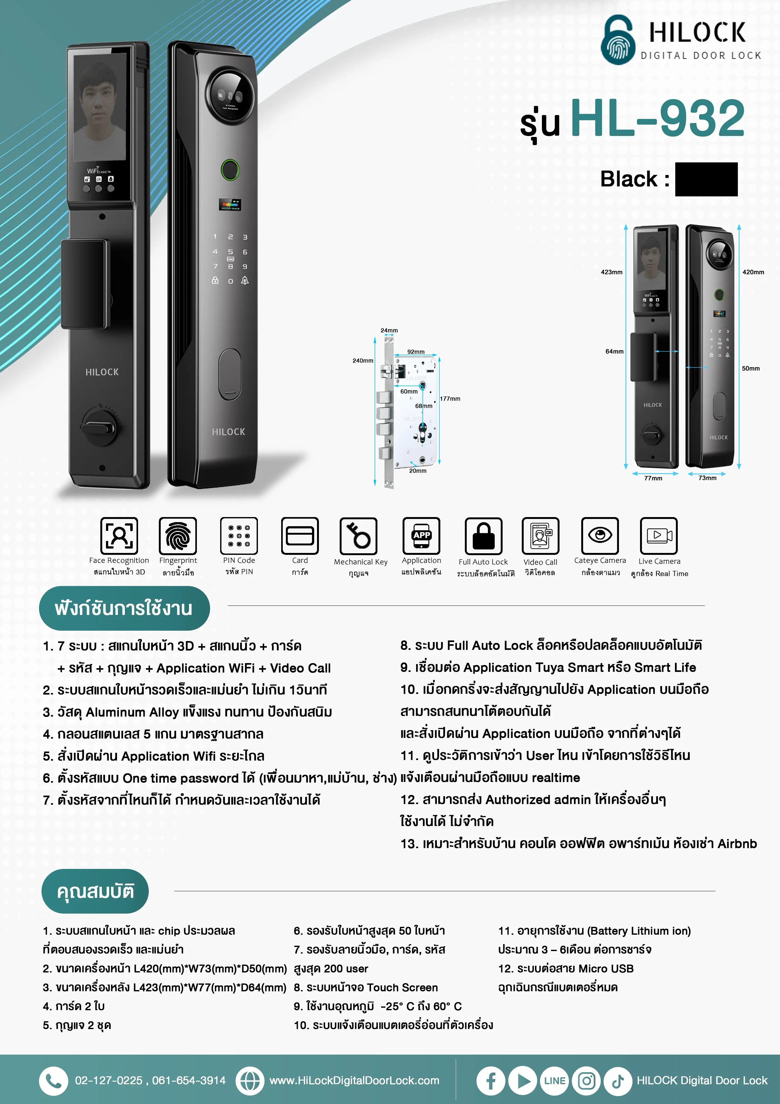 Digital Door Lock รุ่น HL-932 สีดำ ผลิตจากวัสดุ Aluminum Alloy แข็งแรง ทนทาน ป้องกันสนิม สามารถใช้งานด้วยระบบเปิดประตูแบบ 7 ระบบ : สแกนใบหน้า3D + สแกนนิ้ว + การ์ด + รหัส + กุญแจฉุกเฉิน + Application WiFi + Video Call + Live Camera ประตูดิจิตอลมาพร้อมกลอนสแตนเลส 5 แกน