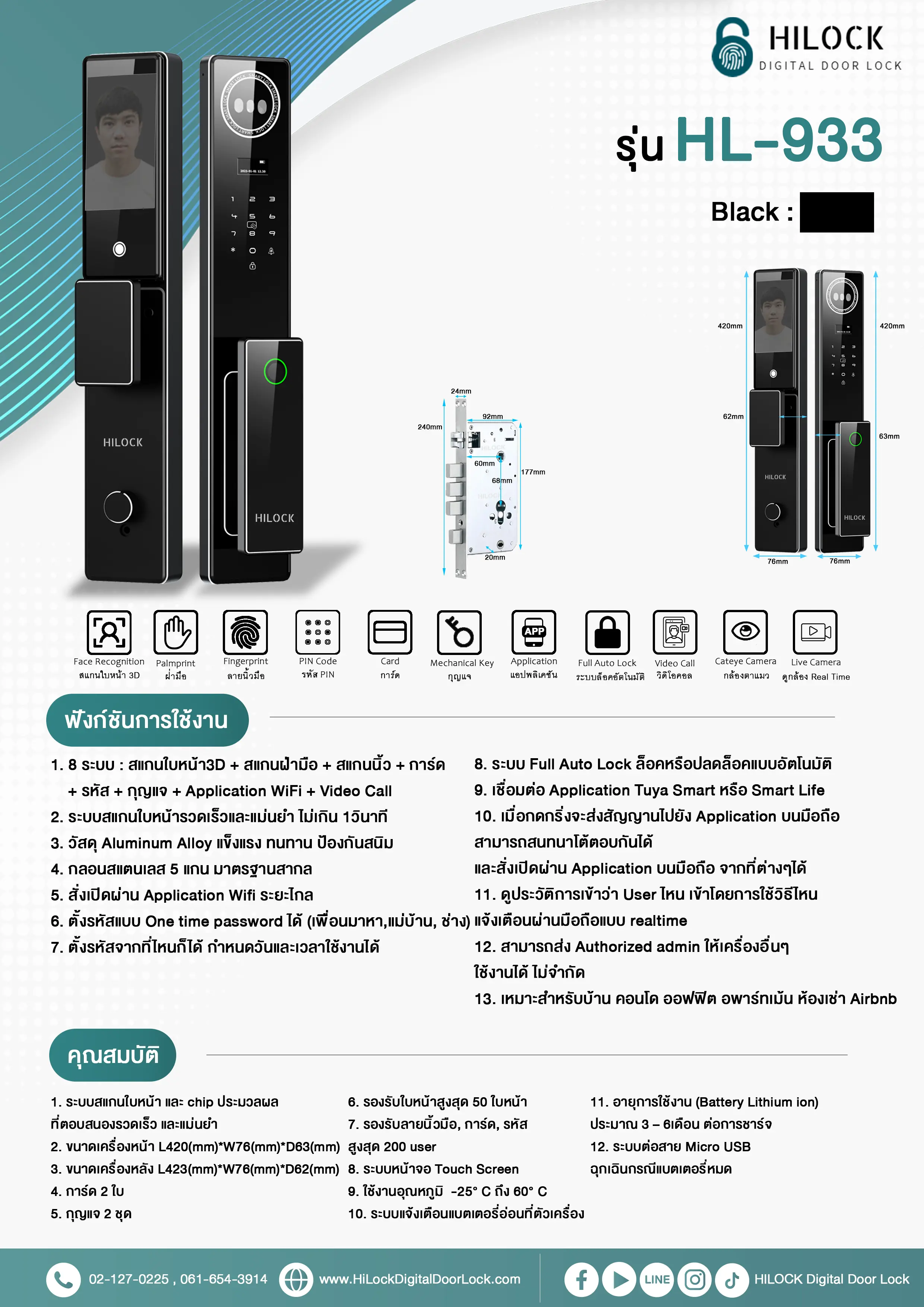 Digital Door Lock รุ่น HL-933 สีดำ ผลิตจากวัสดุ Aluminum Alloy แข็งแรง ทนทาน ป้องกันสนิม สามารถใช้งานด้วยระบบเปิดประตูแบบ 7 ระบบ : สแกนใบหน้า3D + สแกนนิ้ว + การ์ด + รหัส + กุญแจฉุกเฉิน + Application WiFi + Video Call + Live Camera ประตูดิจิตอลมาพร้อมกลอนสแตนเลส 5 แกน