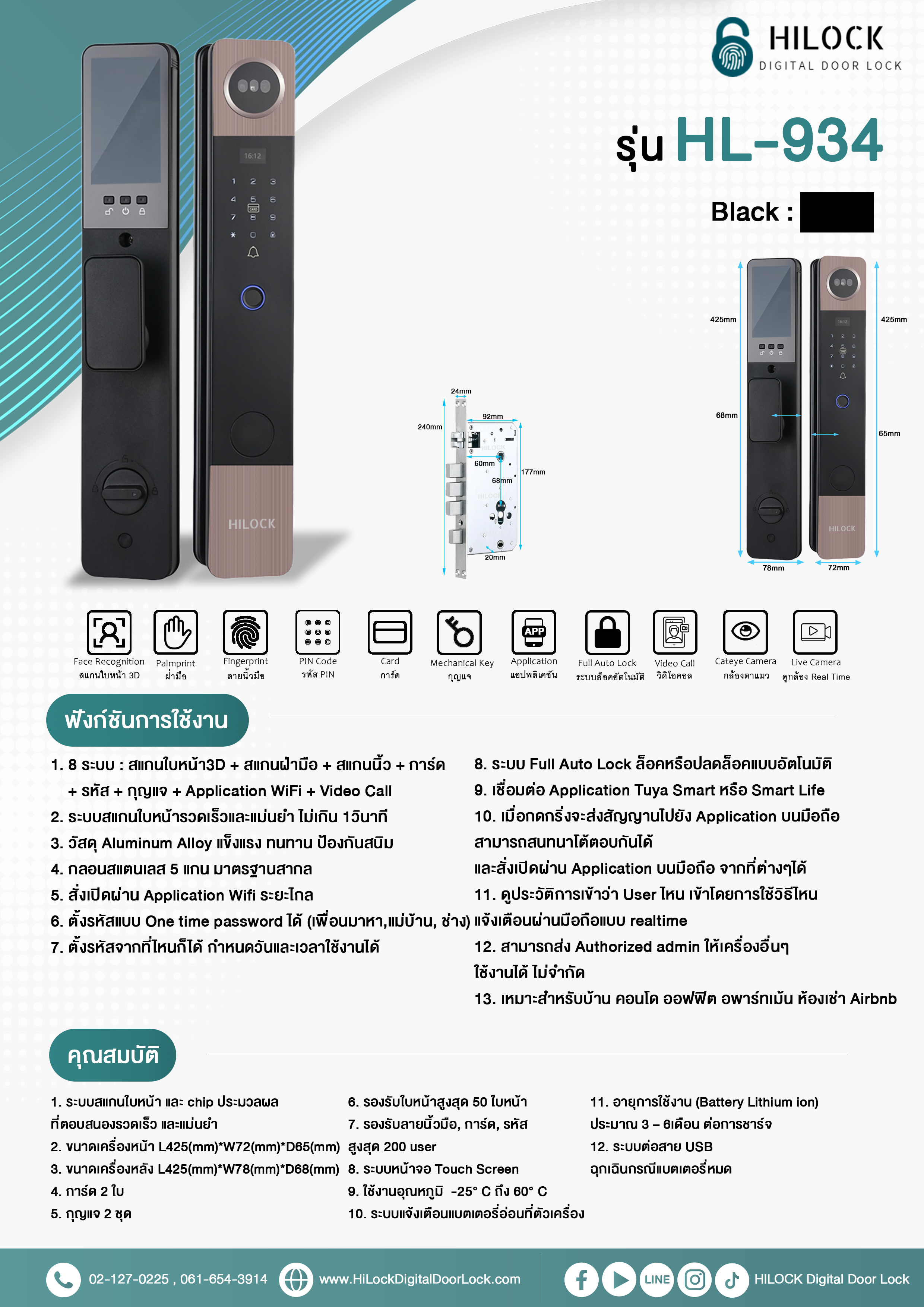 Digital Door Lock รุ่น HL-934 สีดำ ผลิตจากวัสดุ Aluminum Alloy แข็งแรง ทนทาน ป้องกันสนิม สามารถใช้งานด้วยระบบเปิดประตูแบบ 7 ระบบ : สแกนใบหน้า3D + สแกนนิ้ว + การ์ด + รหัส + กุญแจฉุกเฉิน + Application WiFi + Video Call + Live Camera ประตูดิจิตอลมาพร้อมกลอนสแตนเลส 5 แกน